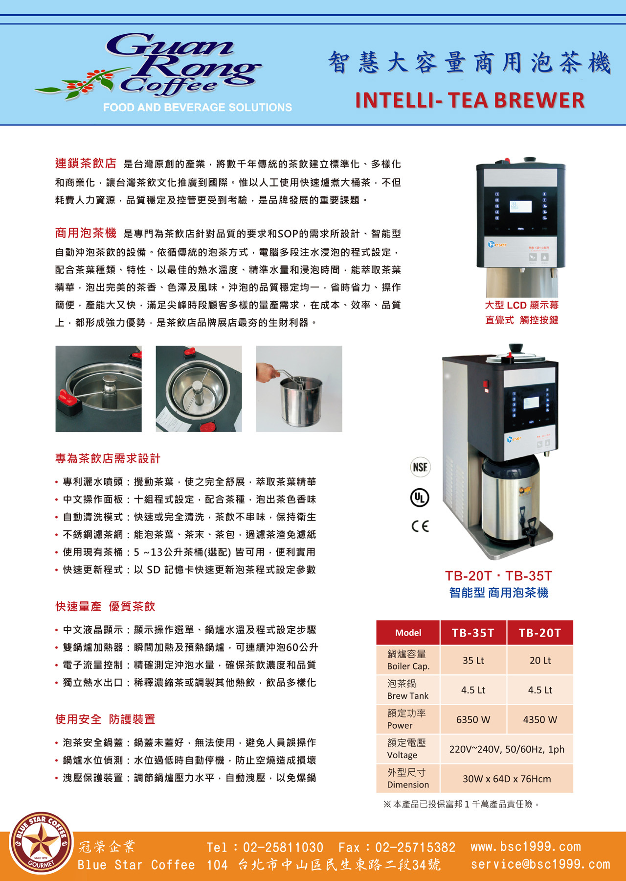 標準化(溫度、時間、水量) 操作簡單(中文介面) 溫度 水量清楚呈現 產量大(單次沖茶4000cc) 亦可選2000cc 不佔空間速度快5鐘即可完成一桶茶 專屬程式一鍵完成 (紅茶/綠茶/烏龍茶/青 茶/奶茶) 商用茶包供應 大小茶包均可 (大茶包50克/小茶包8克) 單鍵使用易操做 全中文化 自動清潔功能 快速清潔 深層清潔 新穎簡約的外型,裝設在吧台非常亮麗 大型LCD顯示幕,直覺式操作觸控按鍵 十組程序記憶鍵,滿足多樣化飲品需求 十六段沖茶程序,調製完美的飲品口味 多茶湯溫層調控,精準掌握各茶湯溫度 具備多項國際認證,操作安全、飲用安心 自動清洗,快速或完全清洗,茶飲不串味 單鍵式OneTouch全自動操作,簡易省時 配備藍芽連結更新參數功